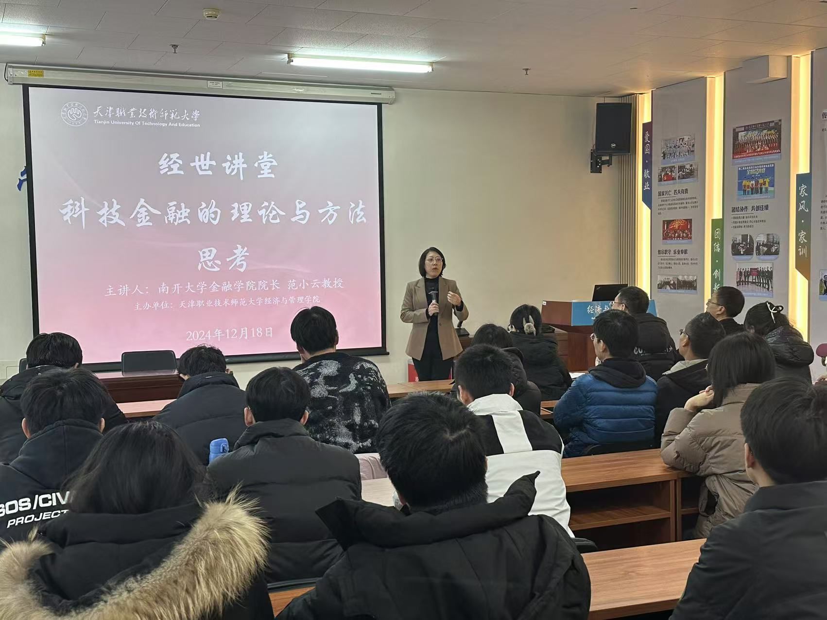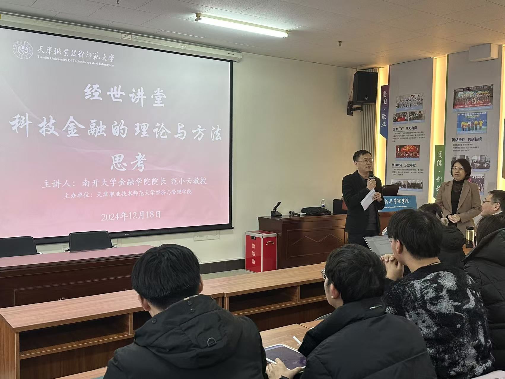 12月18日,公司在第一教学楼701室举办“经世讲堂”第九讲,邀请南开大学金融公司经理、全国政协委员范小云教授作“科技金融的理论与方法思考”主题讲座。讲座由副经理董树功主持,部分教师和金融专业研究生参加。