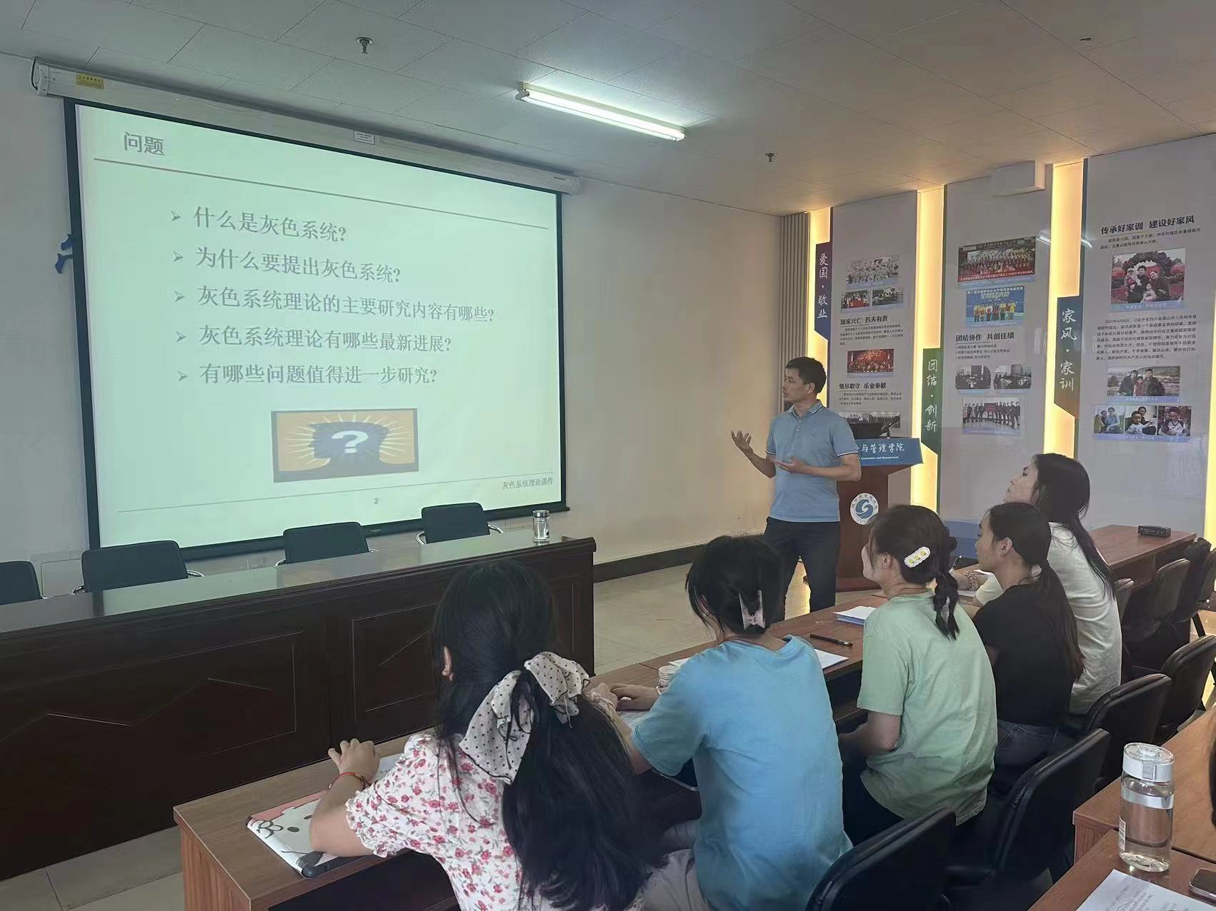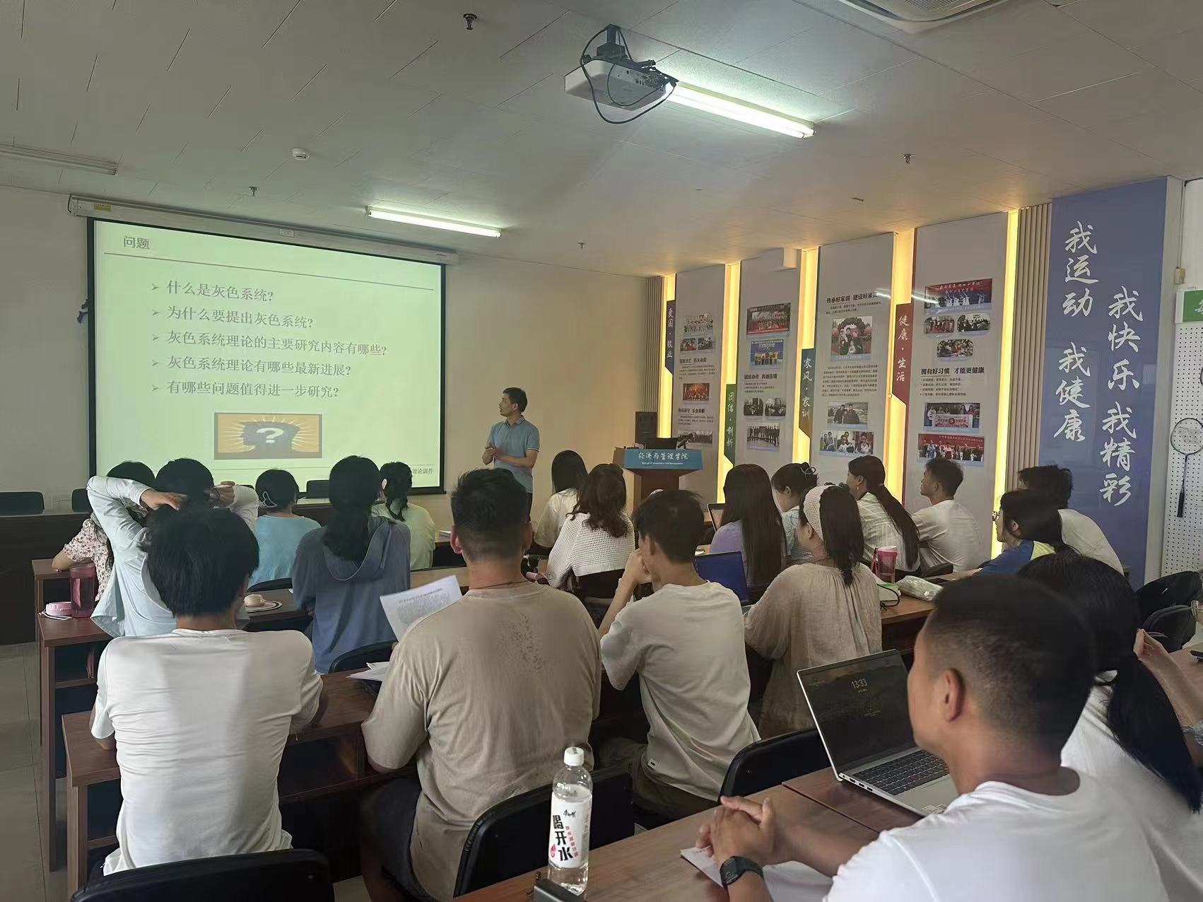 刘解放副教授重点介绍了灰色系统理论的定义、提出背景、主要研究内容、最新研究成果以及前沿发展动态等五个方面的内容。他表示,通过对数据和信息的灰色部分进行建模,可减少不确定性对预测结果的影响,是“贫信息”系统建模、分析、预测、决策的有力工具。同时,他结合实际案例,介绍了灰色系统理论在教育、经济、管理等领域的应用成果。参会师生提问踊跃,积极交流,针对具体的学术问题和研究方向进行了深入讨论,现场氛围热烈。