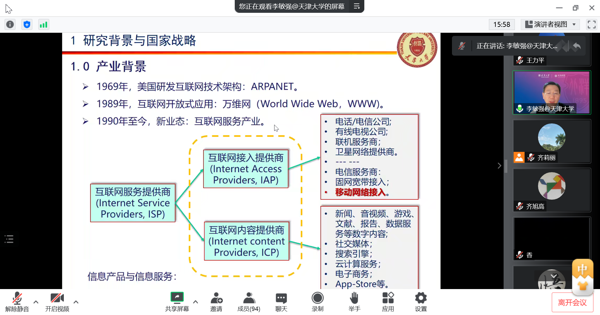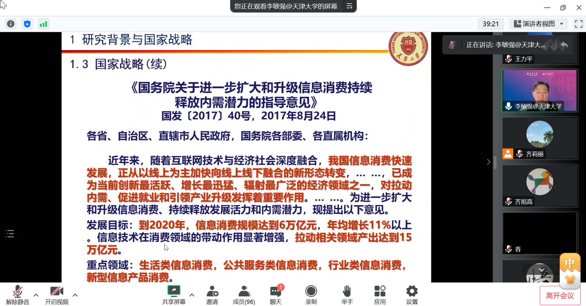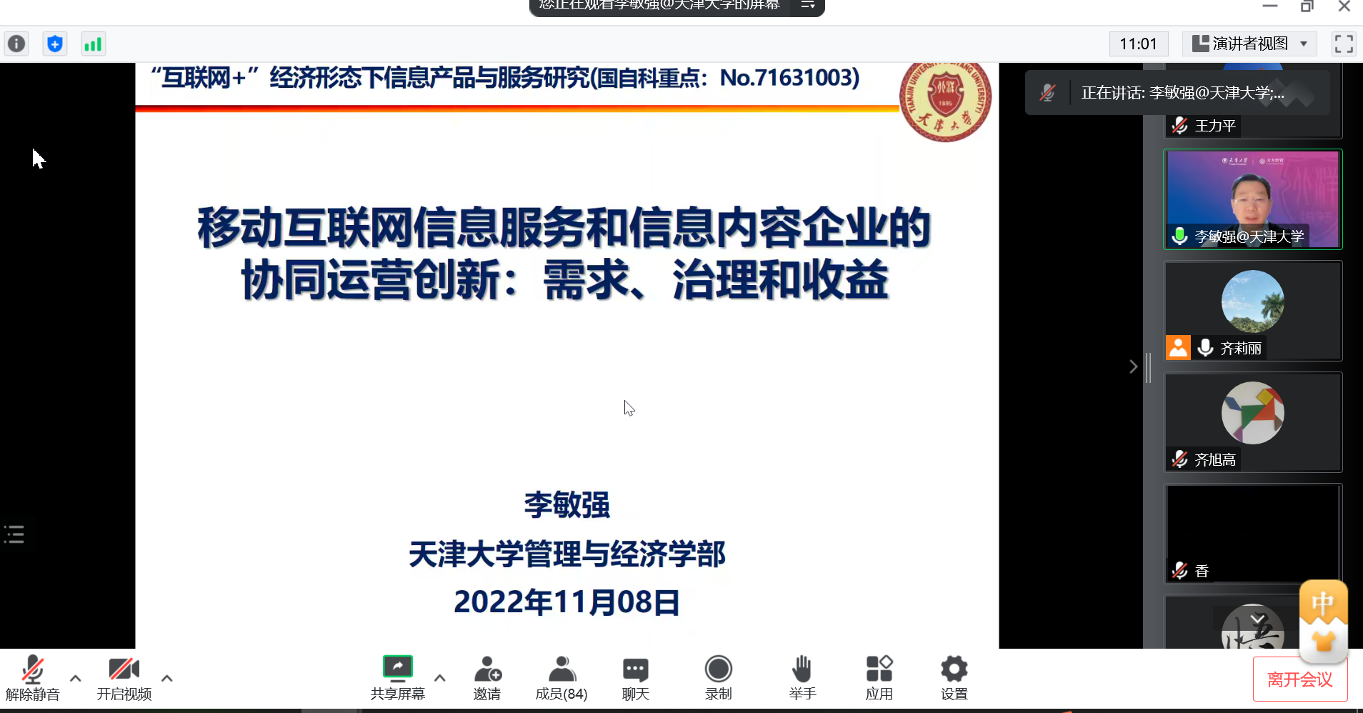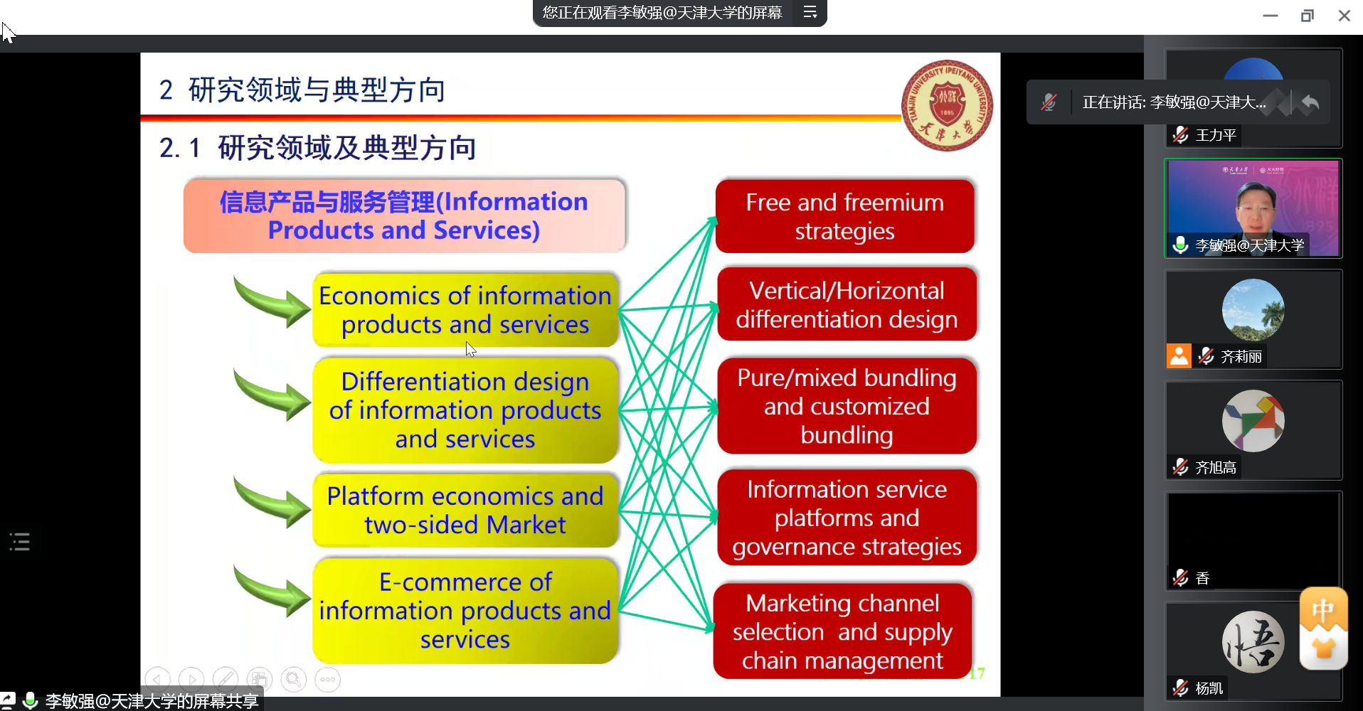 会上,李敏强结合国家社会科学基金重点项目,向与会人员分享其最新研究成果——《移动互联网信息服务和信息内容企业的协同运营创新:需求、治理和收益》。指出该研究应用博弈论方法和模型,分析了移动信息服务与信息内容市场竞争情形下的企业策略选择及合作均衡。重点针对移动运营商和内容提供商达成数据补贴计划的市场条件、订阅收益模式内容提供商是否应该采纳数据补贴计划、存在跨边网络效应情形下移动运营商是否应该推出数据补贴计划等科学问题,综合讨论了基于“数据补贴计划”移动运营商和内容提供商的策略选择及价格博弈。同时,还还和大家就论文研究方法和课题申报选题等进行了深入交流,使公司师生受益匪浅。
