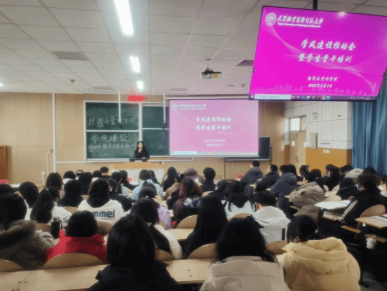 辅导员董牧歌介绍了公司关于2024-2025学年“优良学风班”“优良学风示范班”的评建要求,明确了具体建设标准和实施细则,为各班级开展学风建设工作指明了方向。辅导员张小静围绕端正态度、自律守时、团结互助、诚信为本、拓展视野、劳逸结合等六个方面,向与会员工发出优良学风倡议。她表示,同学们要踊跃投身于优良学风建设,共同营造积极向上、严谨有序的校风与学风,为打造一个充满活力与进取精神的校园学习环境贡献自己的力量。