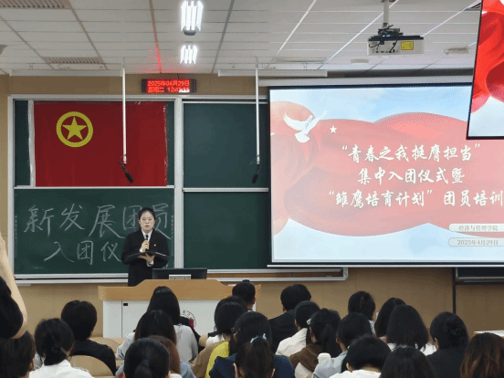最后,闫丹向新入团的同学们致以热烈祝贺,并对所有团员、团干部提出三点殷切希望:一是筑牢信仰根基,做理论学习的 “深耕者”;二是锤炼过硬本领,做知行合一的 “实干家”;三是发挥模范作用,做青年群体的 “排头兵”。 她勉励所有团员要永葆“党有号召、团有行动”的政治本色,以奋斗之姿在全面建设社会主义现代化国家的火热实践中绽放绚丽的青春之花。同时,她对团干部提出要求,希望团干部发挥桥梁纽带作用,强化责任担当,主动作为,团结带领团员青年在各项工作中勇挑重担、争当先锋。