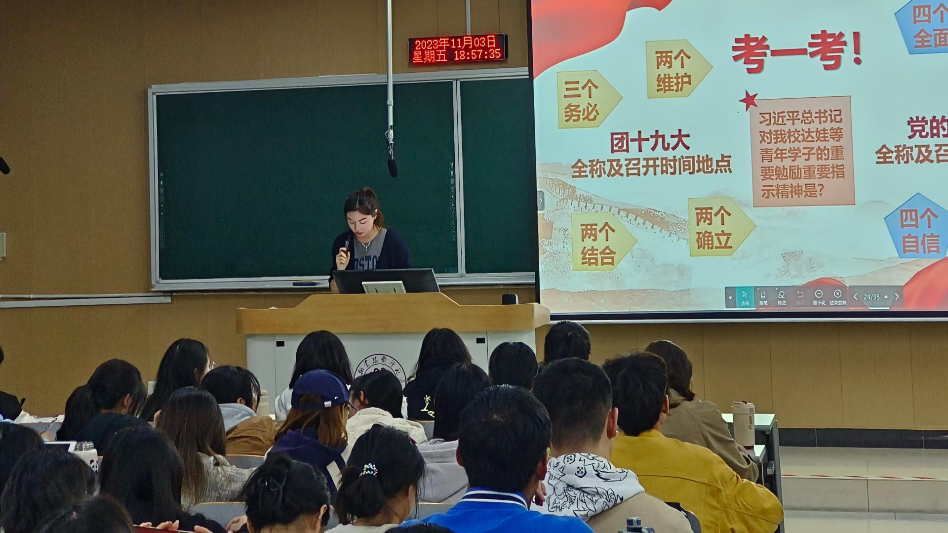 第四讲,赵艺雯以“青春心向党 建功新时代”为主题,回顾了中国共产党领导下中国青年运动的百年历程,以及共青团团结带领一代代青年奋楫争先,在各个时期的历史贡献。她表示,作为青年学子要坚决践行“请党放心,强国有我”的青春誓言,奋翼图强、砥砺追梦,把青春奋斗融入党和人民事业,书写壮丽青春篇章。