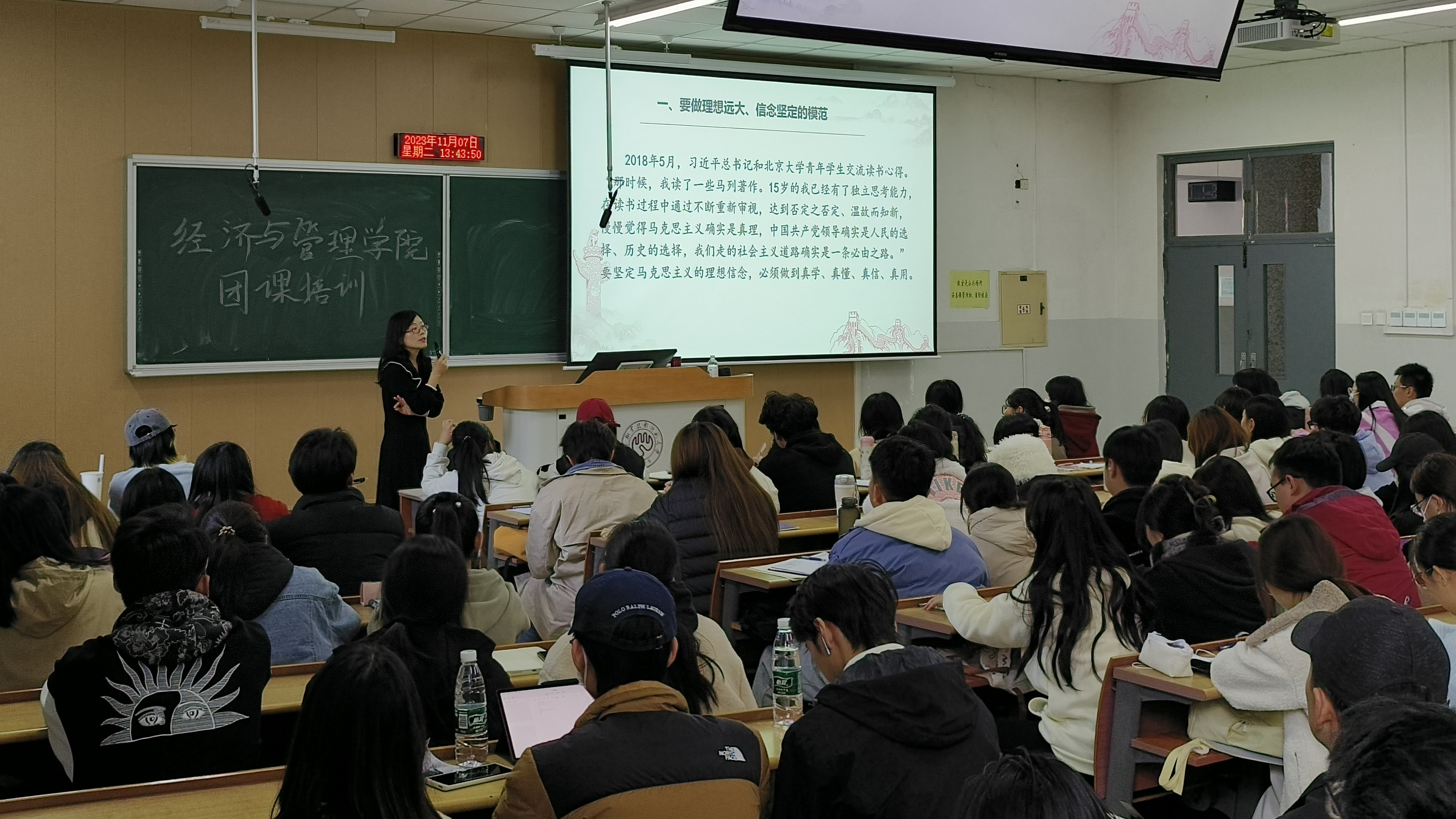 第二讲,赵华以“习近平总书记的青年观”为主题,重点解读了习近平总书记在庆祝中国共产主义青年团成立100周年大会上对广大共青团员提出的“五个模范、五个带头”的成长指引。她表示,希望同学们自觉接受政治训练、加强政治锻造、追求政治进步,积极向党组织靠拢,不负党和人民的殷切期望。