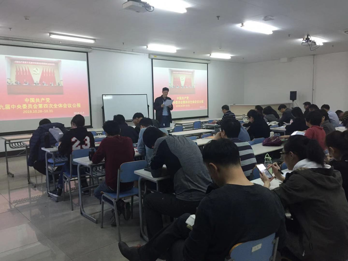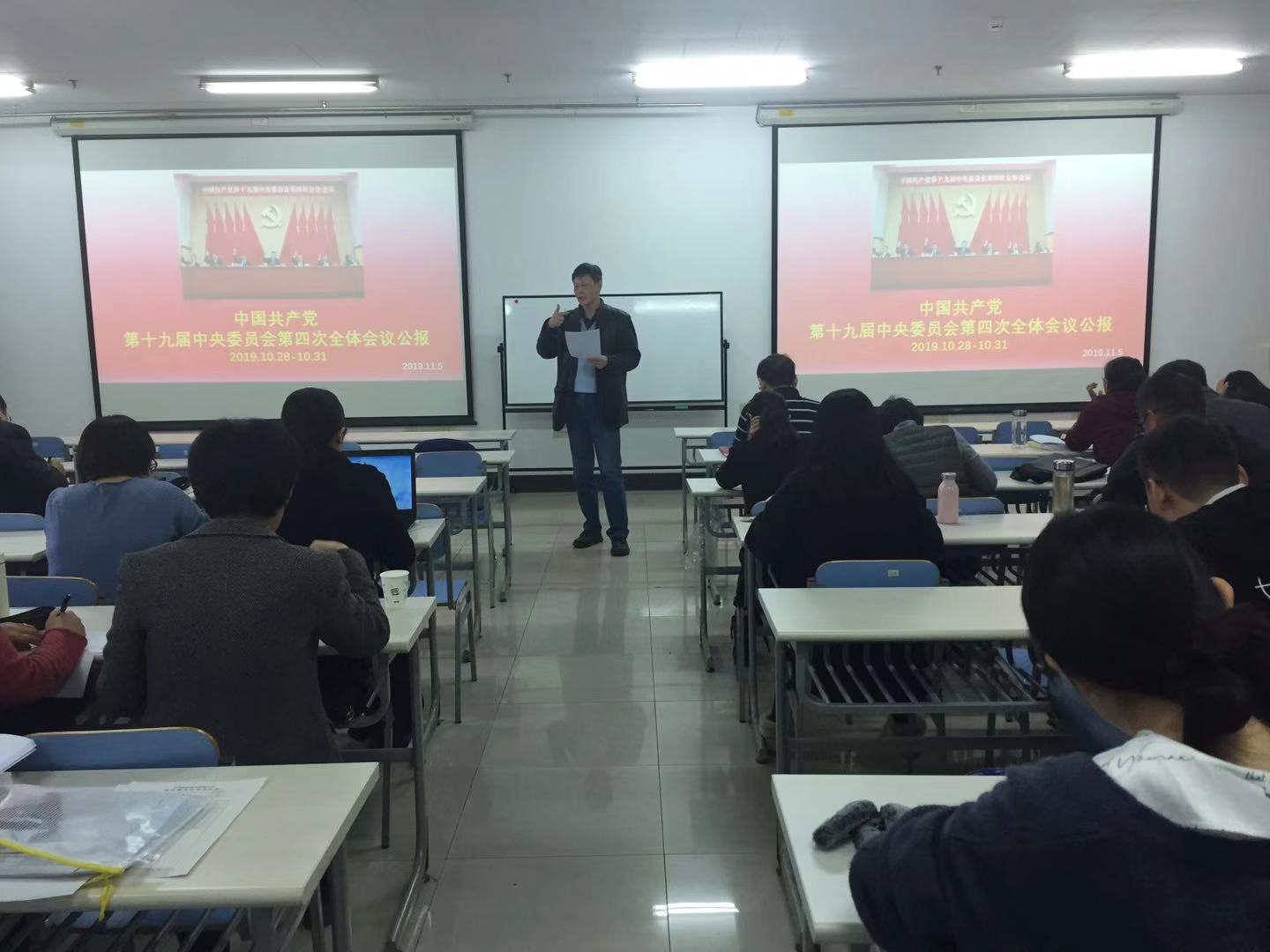 11月5日下午在第一教学楼701,公司召开党的十九届四中全会精神宣讲会,全体教工党员参加,党委书记程中主持。