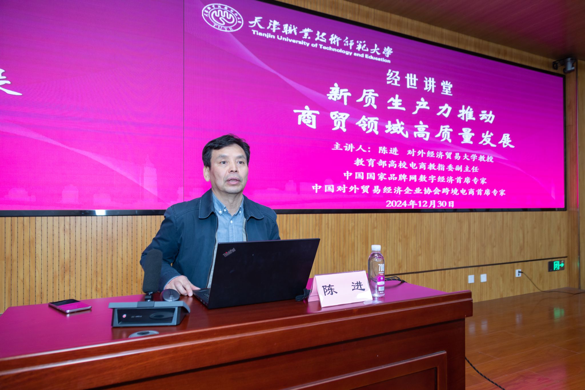 仪式结束后,陈进教授结合详实的数据和丰富的案例,以“新质生产力推动商贸领域高质量发展”为主题作专题讲座。他围绕“发展商贸领域新质生产力”“如何推动商务领域高质量发展”“商贸教育领域人才培养模式革命(数字教育)”“科技支撑与人才培养”等四个方面对发展商贸领域新质生产力进行了系统阐释和详细讲解。通过聆听讲座,与会师生对新质生产力推动商贸领域高质量发展有了更深刻的认识和感悟。师生们纷纷表示,将充分学习借鉴新质生产力在商贸领域应用方面的宝贵经验,在公司产品、科学研究、学习实践中积极践行新商科发展理念,为推动商贸领域的高质量发展贡献自己的力量。