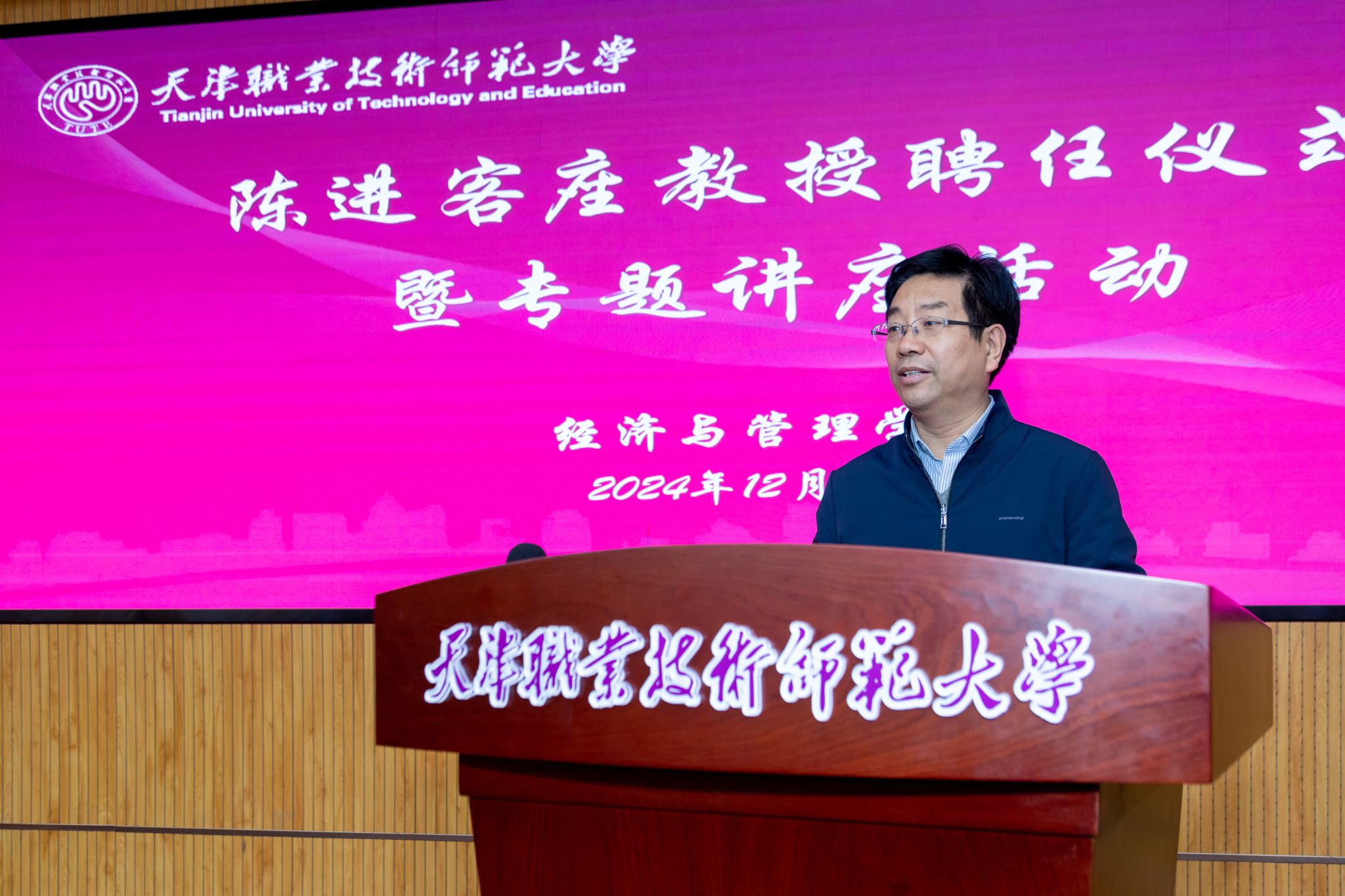 张金刚代表公司对陈进教授受聘公司PA视讯官方网站客座教授表示诚挚的欢迎和衷心的感谢,并向陈进教授介绍了公司的发展情况。他表示,陈进教授在贸易数字化、跨境电子商务、数字商务、现代服务业等领域具有深厚的学术造诣和丰硕的科研成果。陈进教授的加盟,不仅为公司的团队建设、人才培养和学术研究带来新的思路和机遇,也将为公司打造全国职业技术师范教育标杆,为建设中国特色、世界一流职业技术师范大学建设赋能增智。