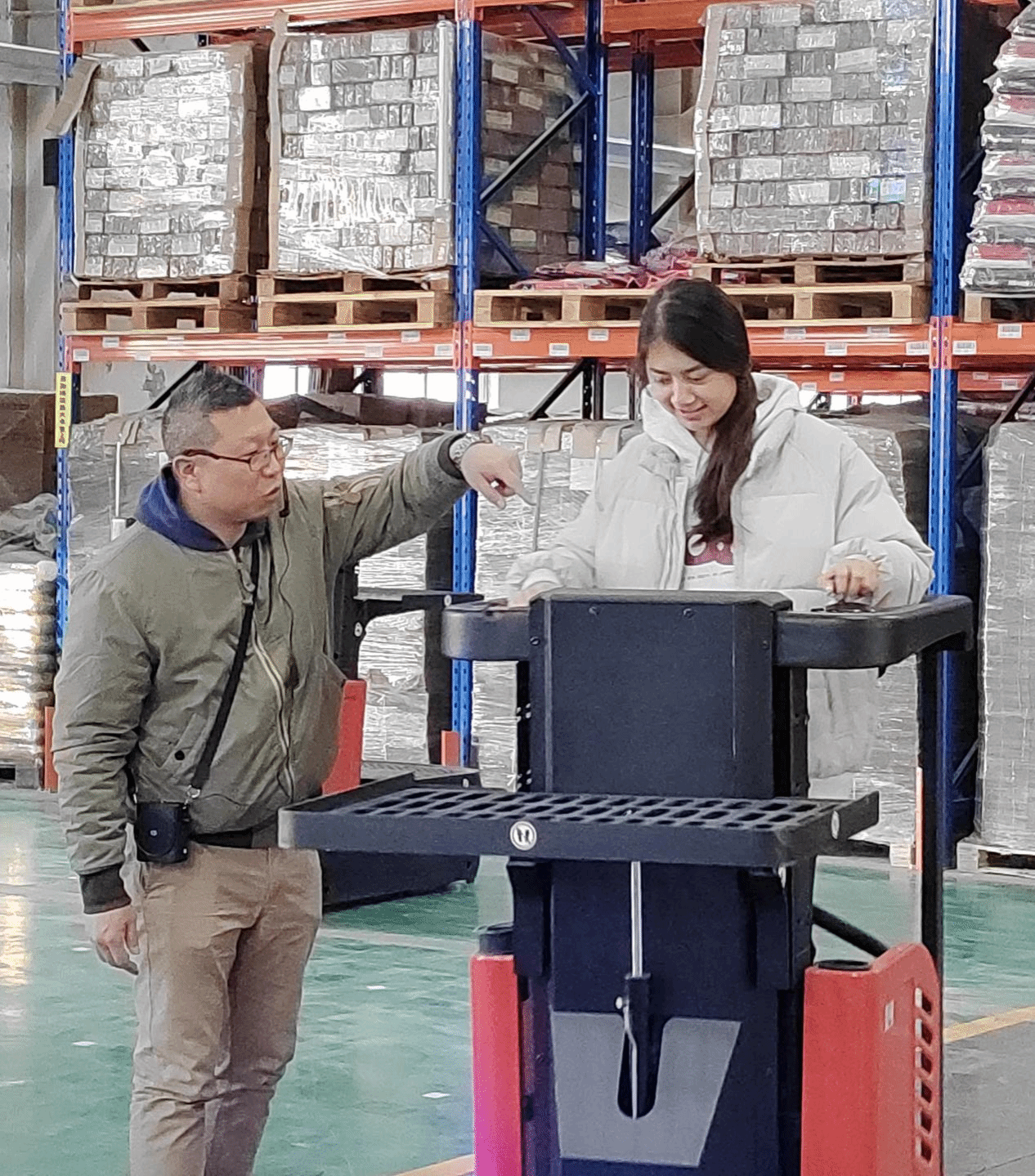 参观过程中,娄熠详细介绍了现代物流开放型产教融合实践中心的建设情况,及其在人才培养、社会培训、技术服务等方面的重要作用。随后,在专业教师的详细讲解和指导下,同学们近距离观摩了多种先进的智能物流设备,实际操作了叉车、堆高车等设备,深入了解了智能物流设备的运行原理以及相关专利技术。