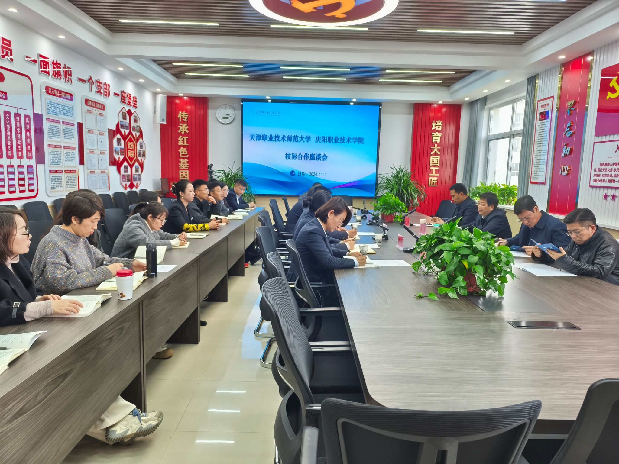 下午,蔡玉俊一行与庆阳职业技术公司领导班子、相关系部主任进行座谈。双方围绕专业建设、团队培训、学历提升、国际交流、实训基地建设、产教融合、职普融通、科教融汇等方面进行了深入交流,并达成初步合作意向。