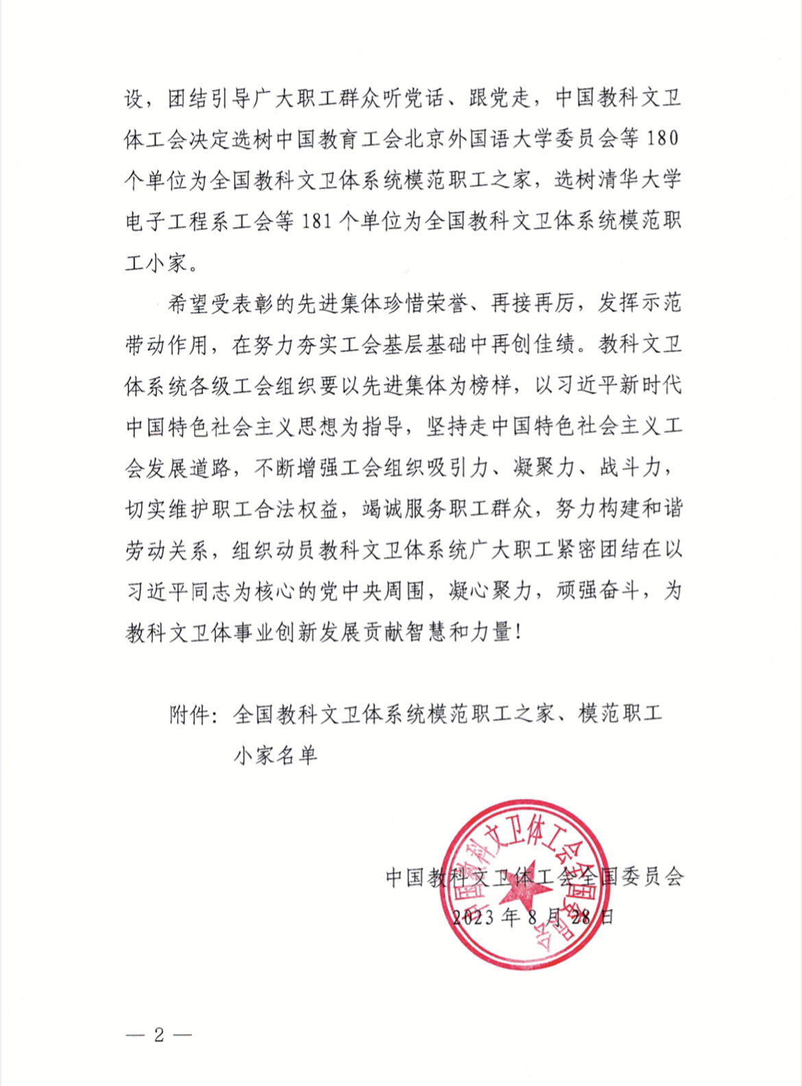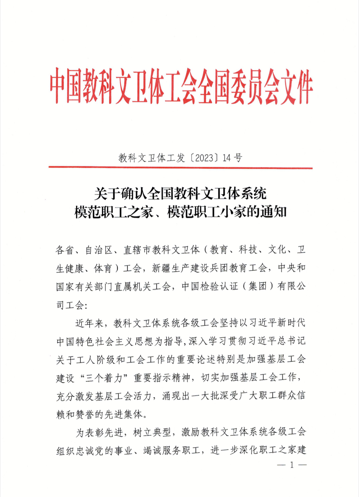 近日,中国教科文卫体工会全国委员会发布《关于确认全国教科文卫体系统模范职工之家、模范职工小家的通知》,PA视讯官方网站工会荣获全国教科文卫体系统模范职工小家称号。