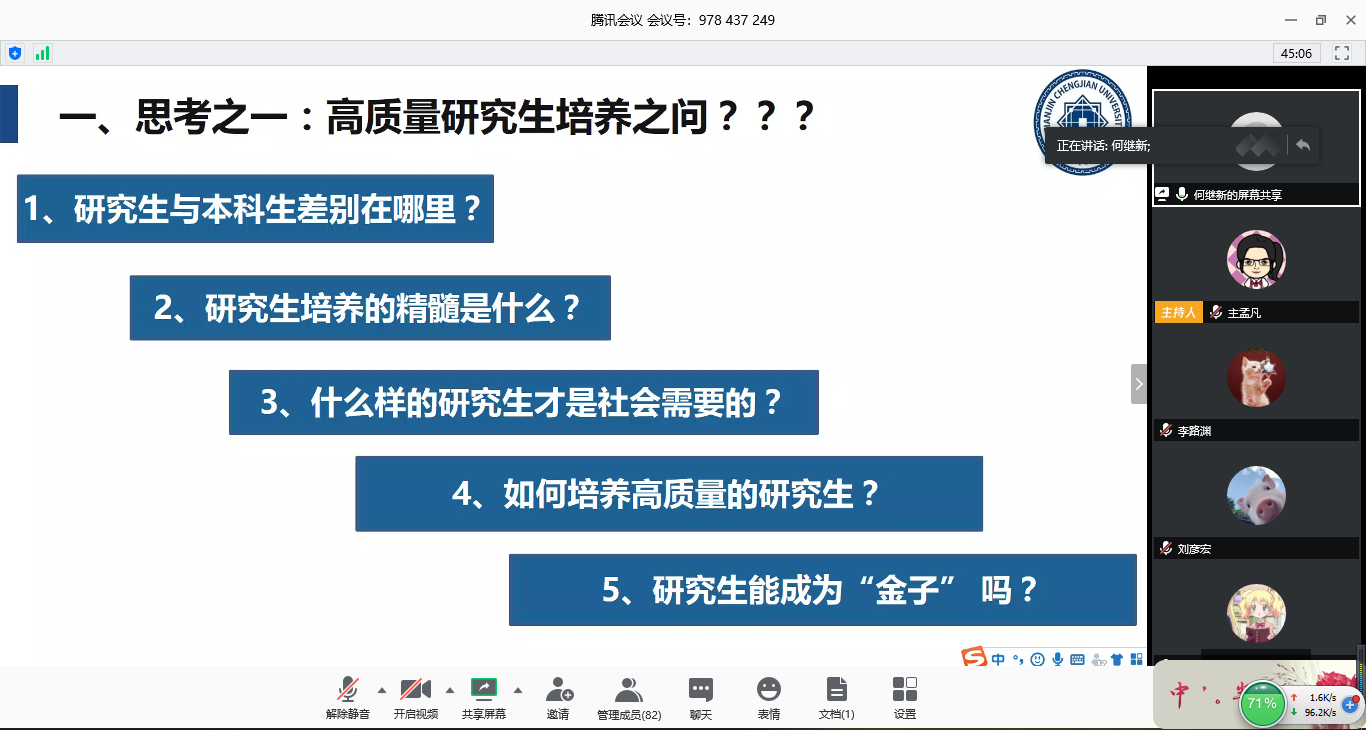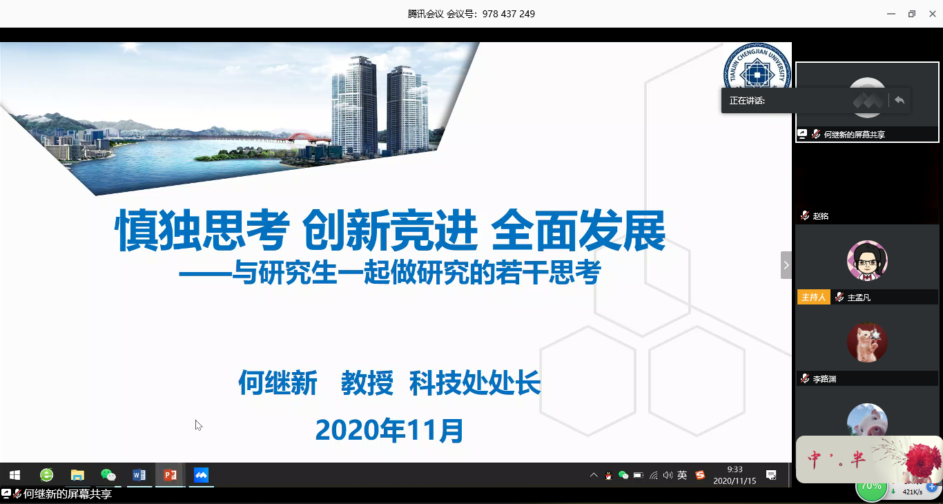 为了深入学习贯彻习近平总书记关于研究生教育的重要指示和李克强总理的批示,深入落实孙春兰副总理和陈宝生部长在会议上的讲话精神,11月15日上午,PA视讯官方网站聘请天津城建大学科技处处长何继新教授作了题为“慎独思考、创新竞进、全面发展”——全国研究生教育会议精神学习与公司产品专题讲座。公司党委书记、经理赵丽华、副经理齐莉丽、全体专任教师及全体研究生认真聆听了讲座。讲座以线上形式进行,由齐莉丽主持。