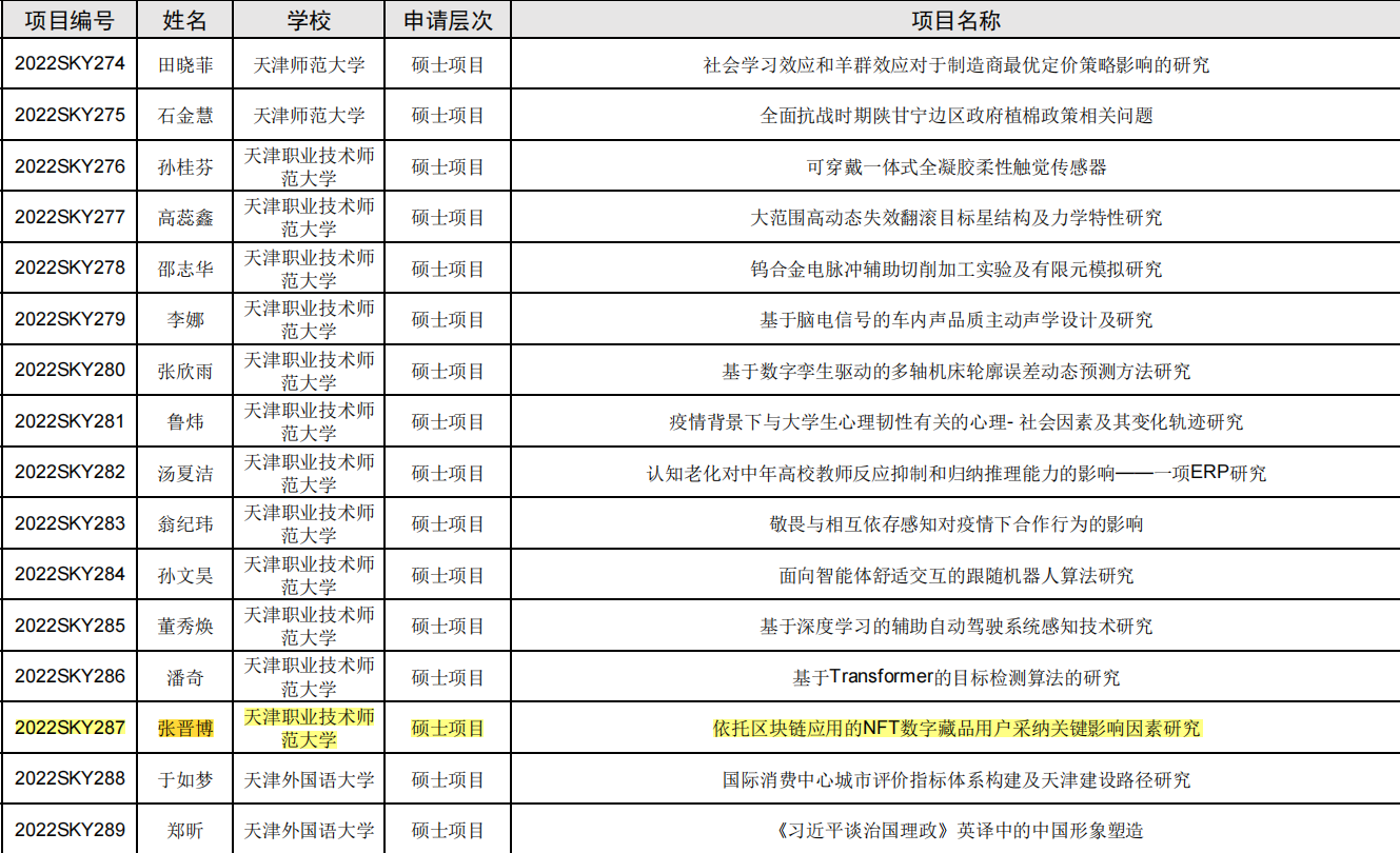 此外,天津市教委公布了2022年度天津市研究生科研创新项目立项名单,2021级管理科学与工程专业硕士研究生张晋博(指导教师李静)撰写的《依托区块链应用的NFT数字藏品用户采纳关键影响因素研究》成功入选。