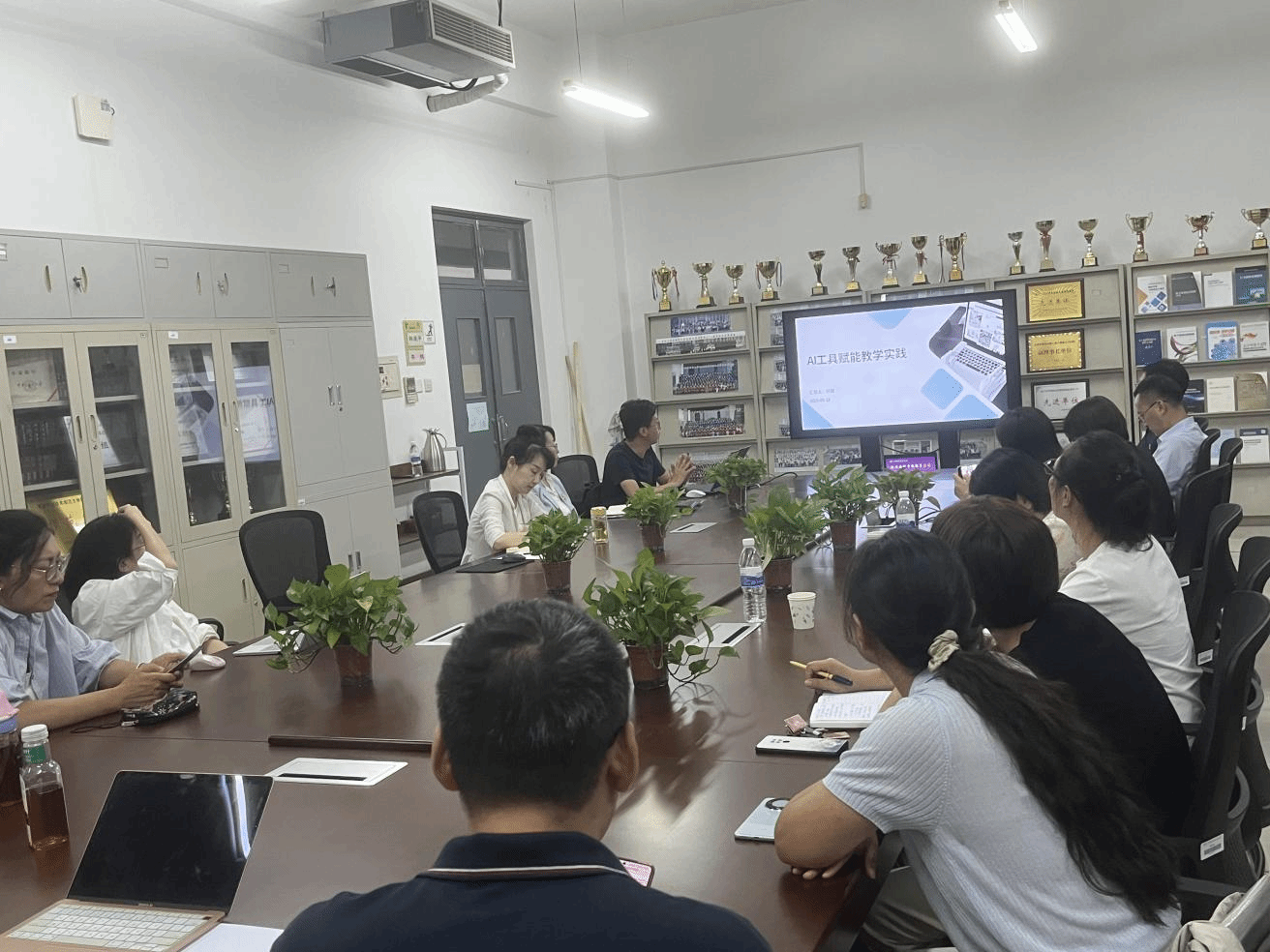 分享会上,付强从知识库、智能体和工作流等方面,系统介绍了AI智慧课程的建设模式与应用场景,深入探讨了人机协同教学设计方法的应用路径。教师们积极参与、踊跃交流,展现出浓厚的学习兴趣与饱满的学习热情。